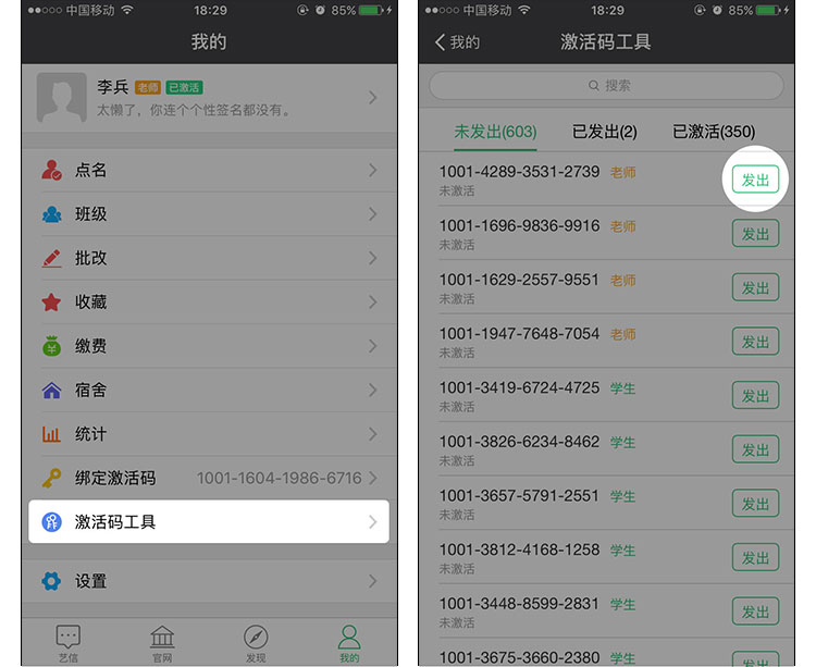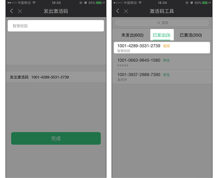 后台开通激活码工具功能后,在【我的】里面选择【激活码工具】,选择对应激活码点击【发出】,备注好之后【完成】,即可在【已发出】栏中看到发出的未使用激活码。